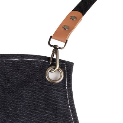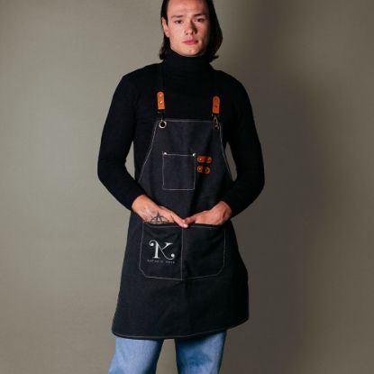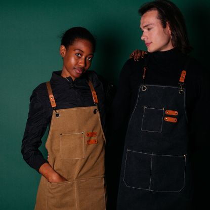 Avental fabricado em mistura de 50% algodão e 50% poliéster.