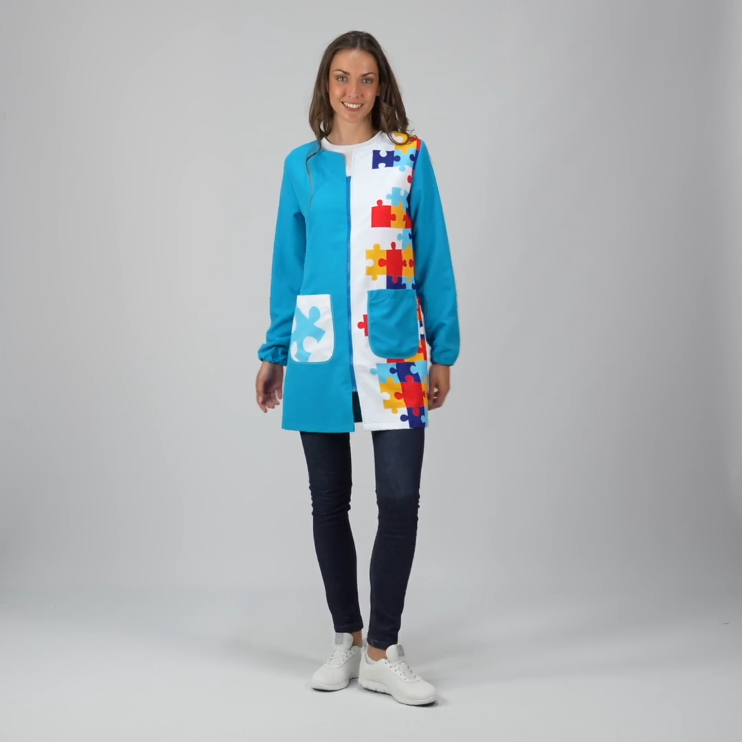O fecho de correr central facilita a colocação e a retirada da bata de forma rápida e confortável.