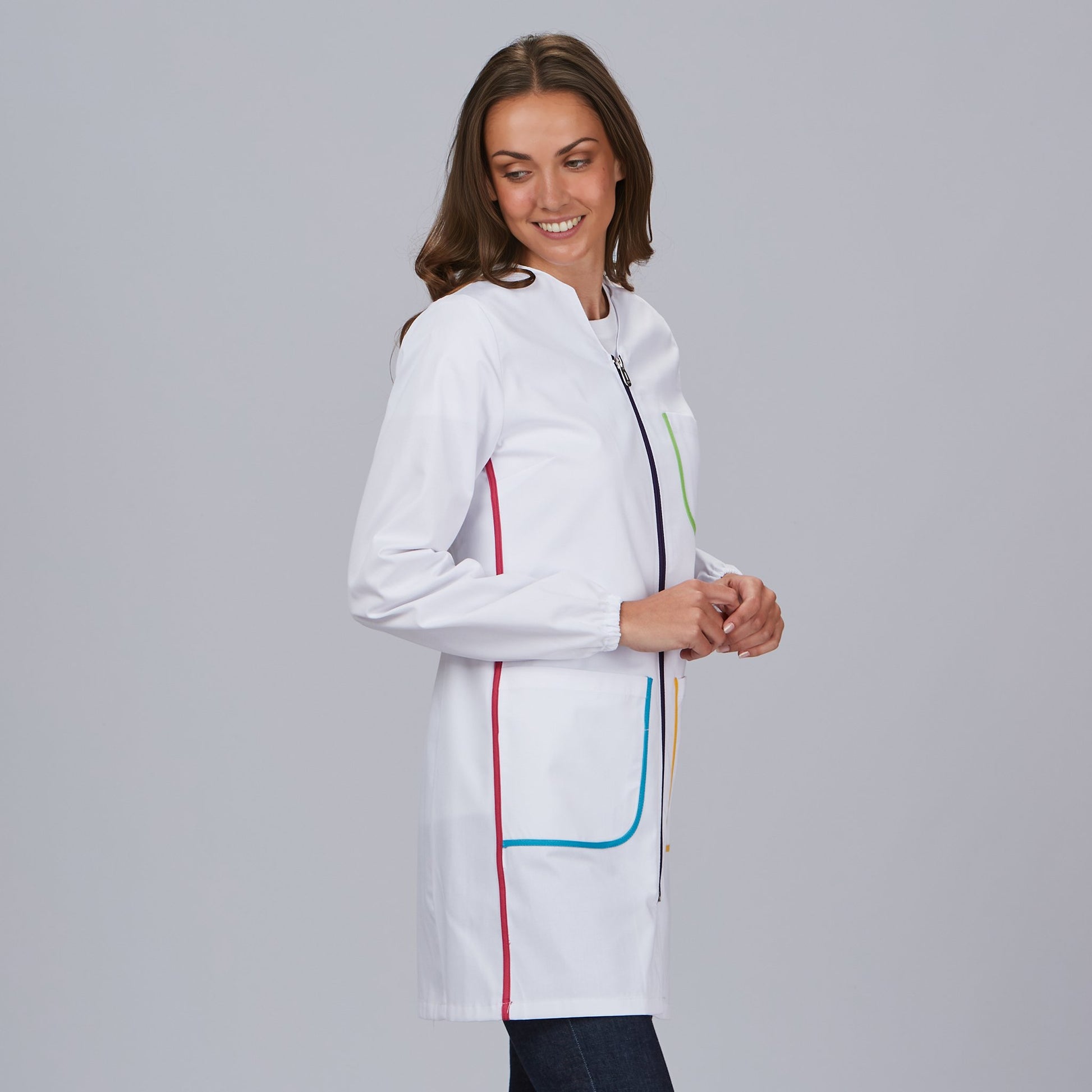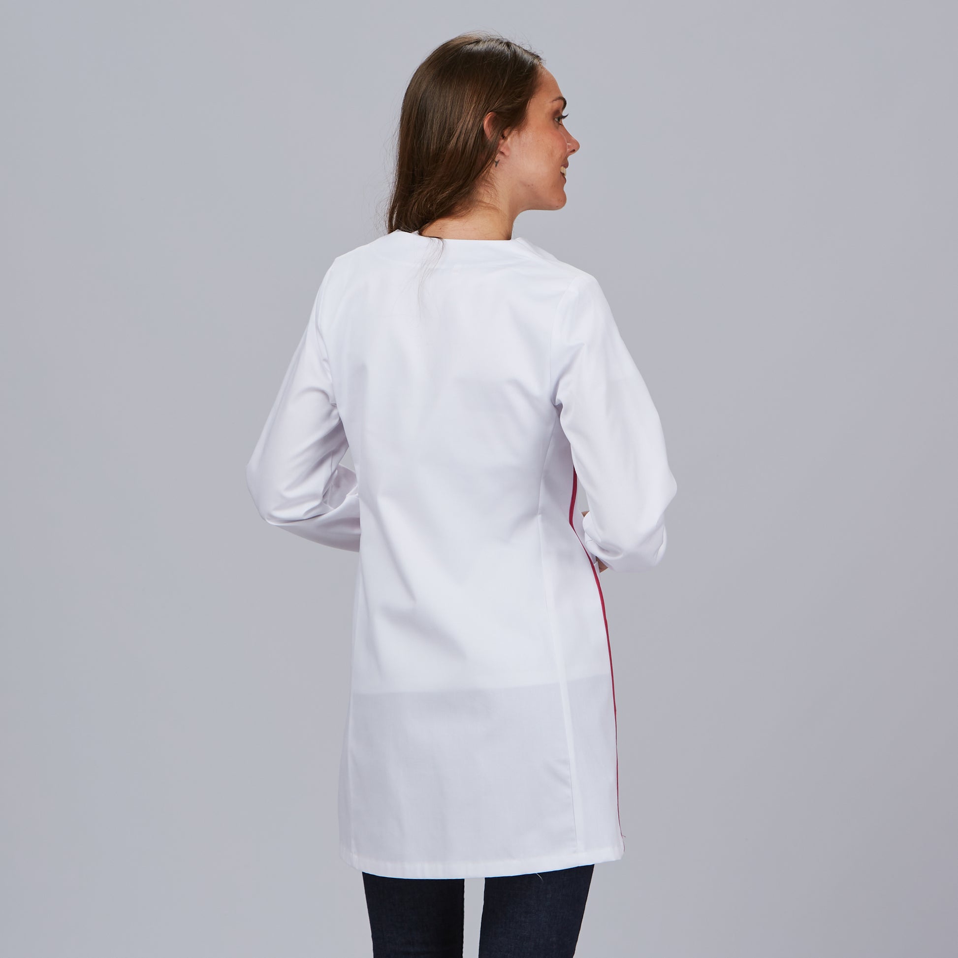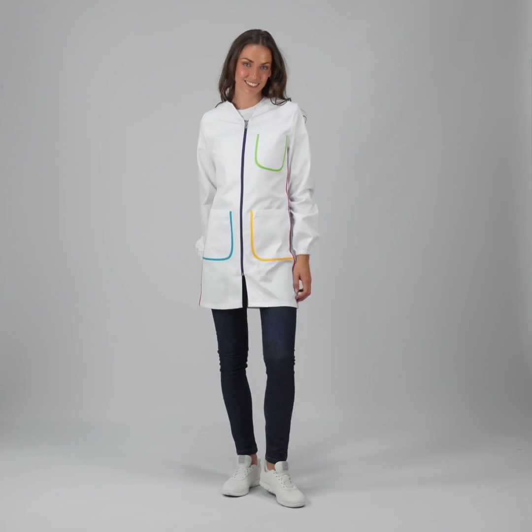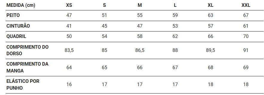 O modelo de manga comprida, fecho de correr central, punhos elásticos tem dois bolsos laterais e um bolso esquerdo no peito, semi-ajustado com dardos nos lados e nas costas oferece um ajuste lisonjeiro e confortável.