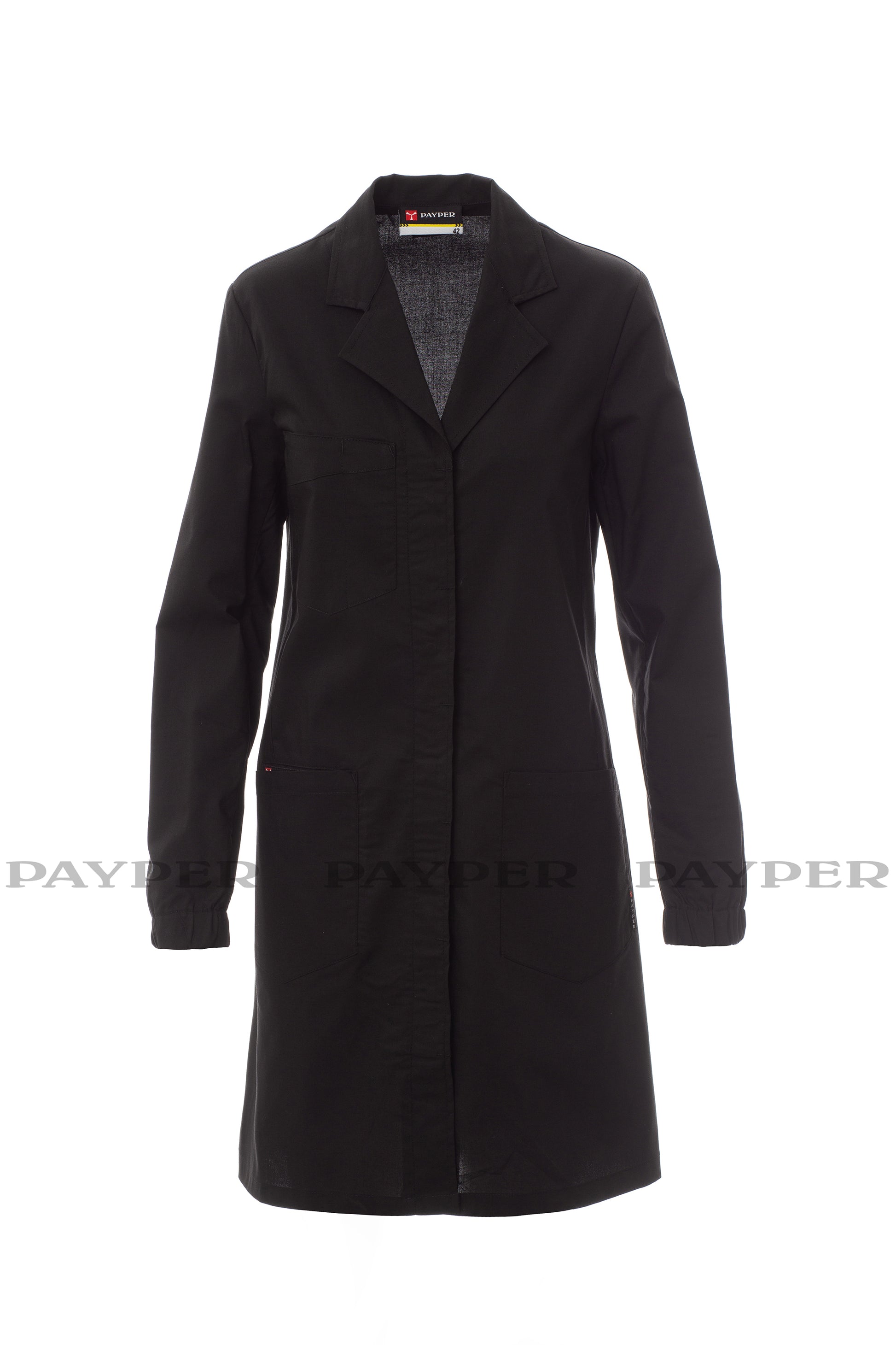 Bata de senhora, gola com lapela, na frente com botões de pressão com carcela escondida, dois bolsos de chapa, um bolso no peito com porta-canetas, dois bolsos na cintura, um pequeno bolso para smartphone, escapulário liso nas costas, cortes nas parte posterior para facilitar os movimentos, mangas compridas com punhos elásticos.