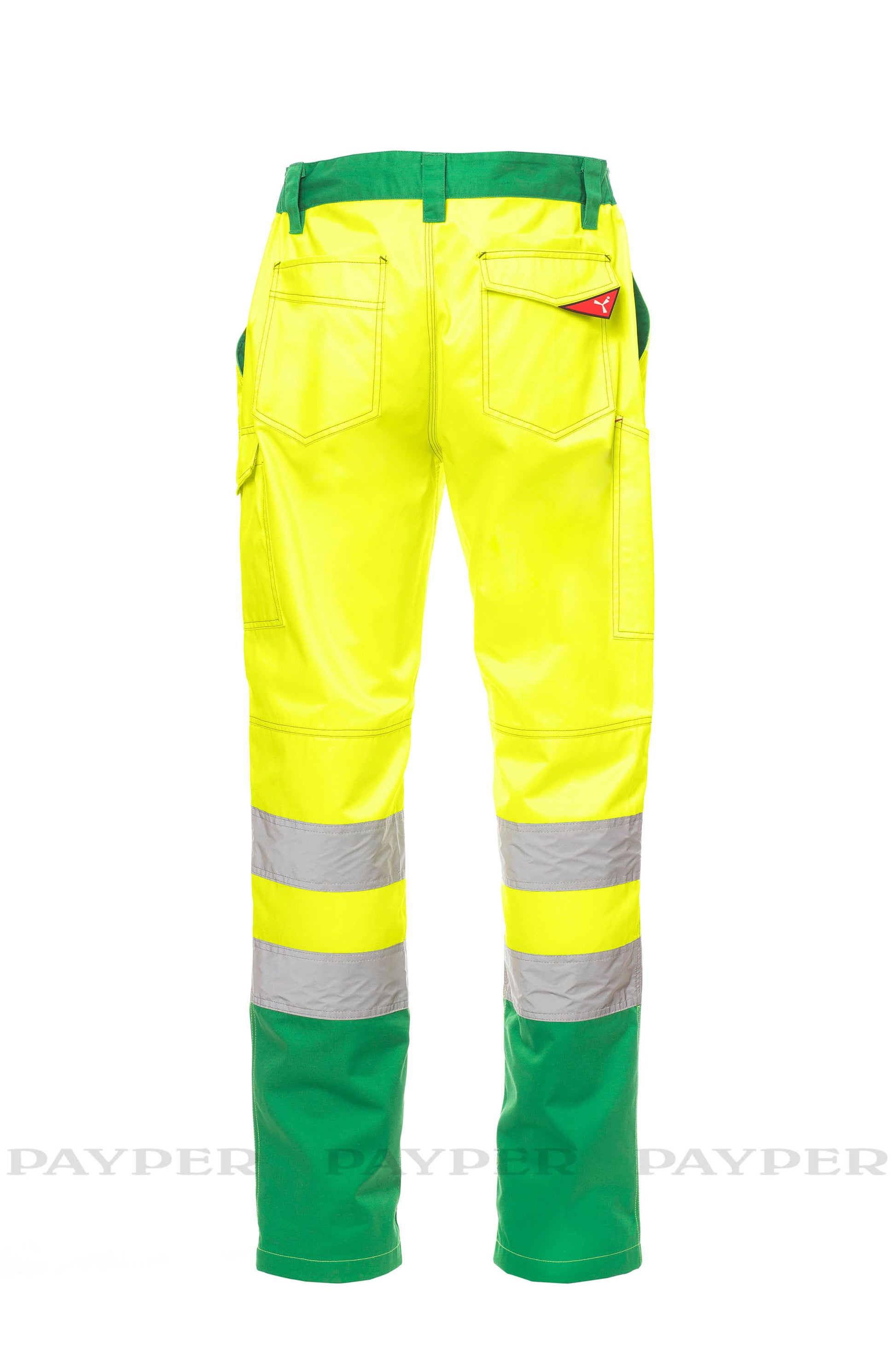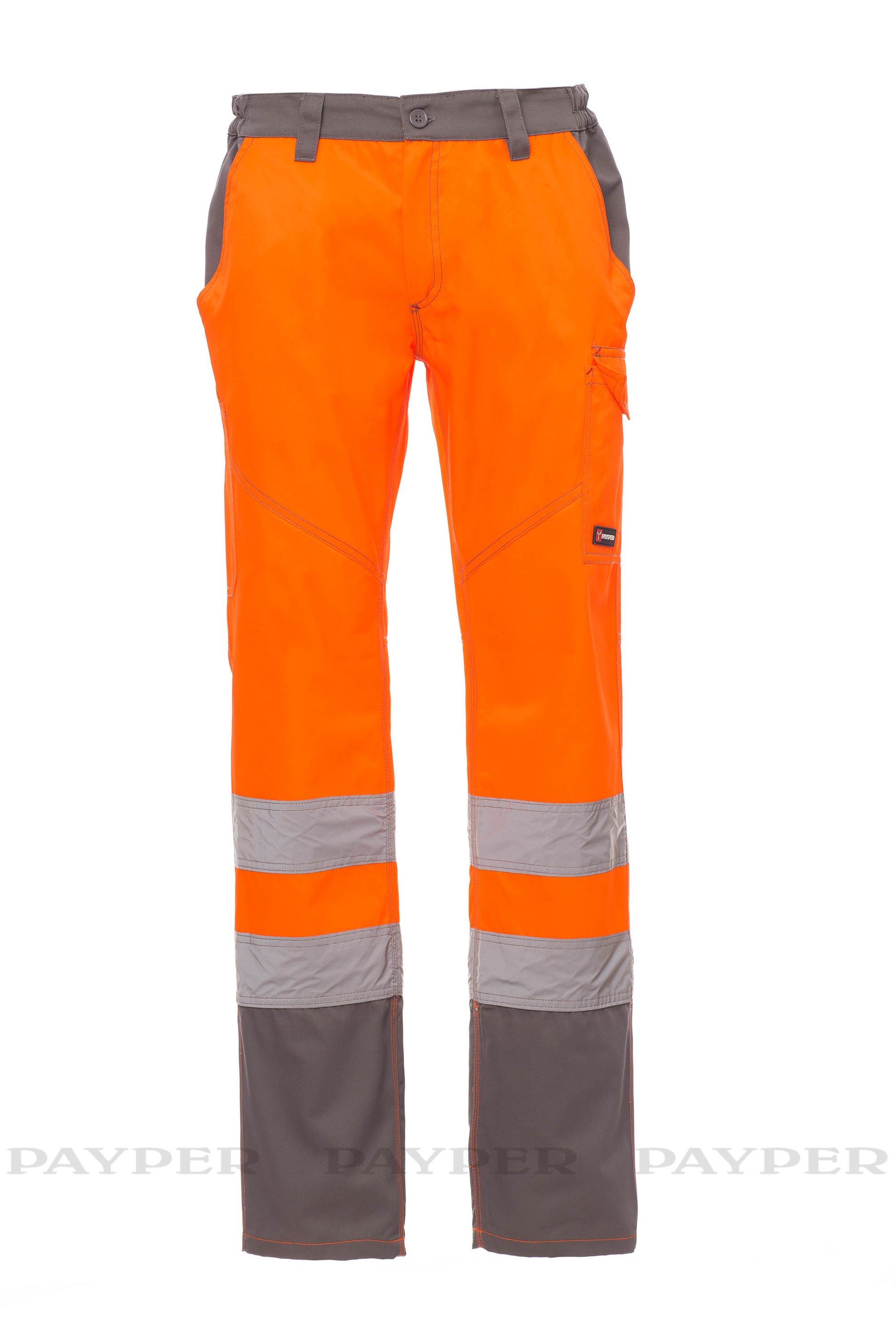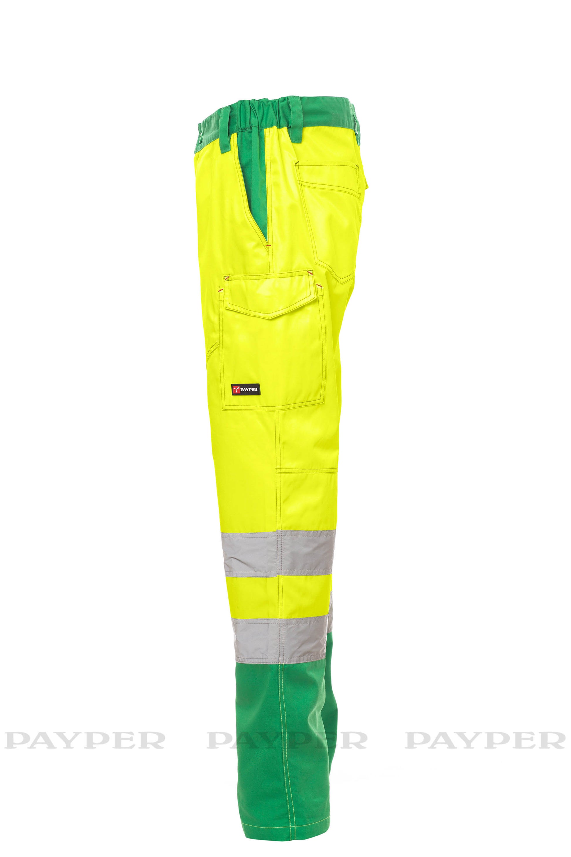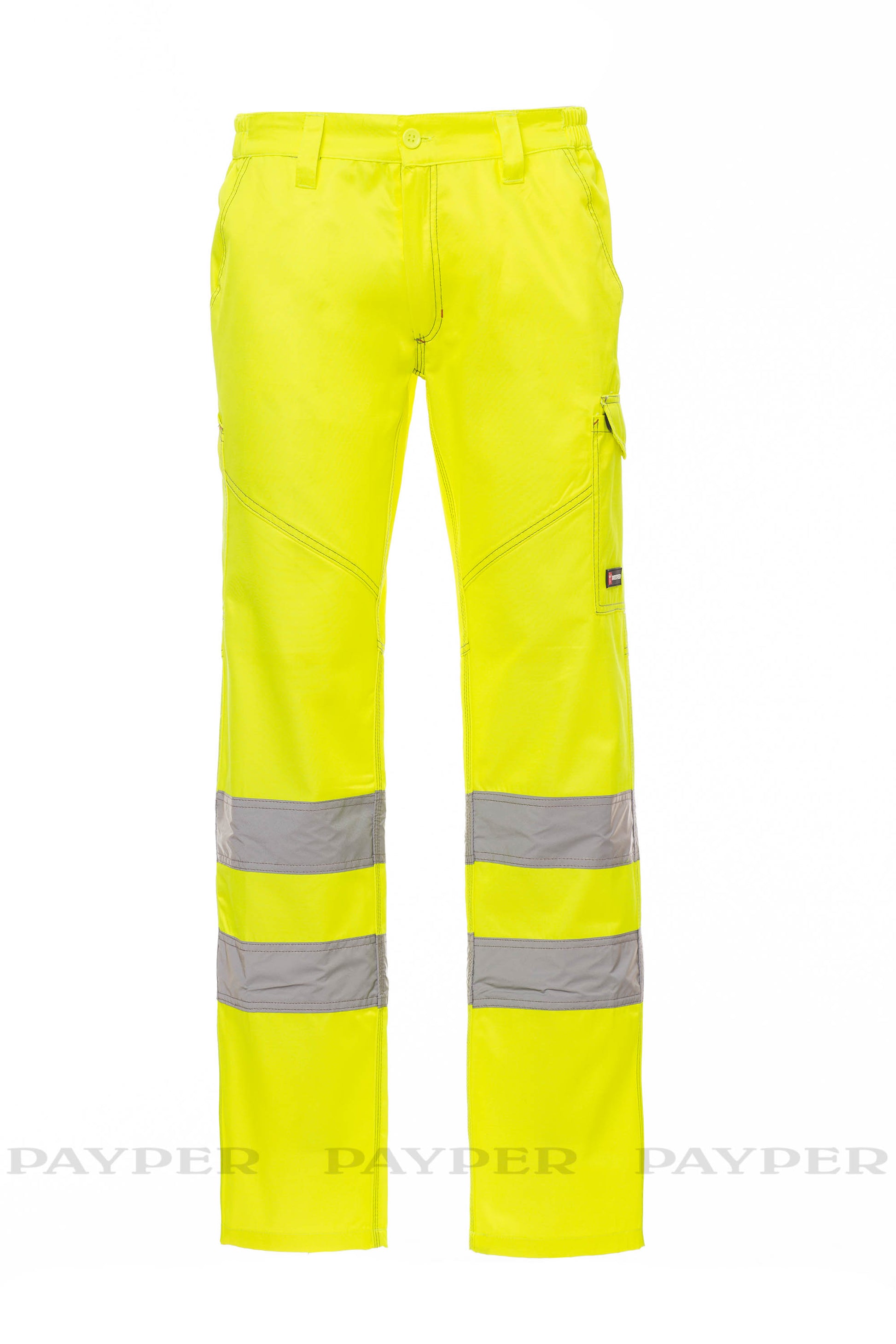 Calças para todas as estações, em dois tons, de alta visibilidade, de homem com faixas refletoras, cós com presilhas e elástico lateral. Fecho de correr com botão de plástico, dois bolsos dianteiros clássicos, um bolso lateral com LOCK SYSTEM, um bolso de fita métrica, dois bolsos traseiros, um aberto e um com aba e Velcro. Costura contrastante, entrepernas e parte interior da perna de costura tripla. Composição 50% ALGODÃO 50% POLIÉSTER 250 GR/MQ