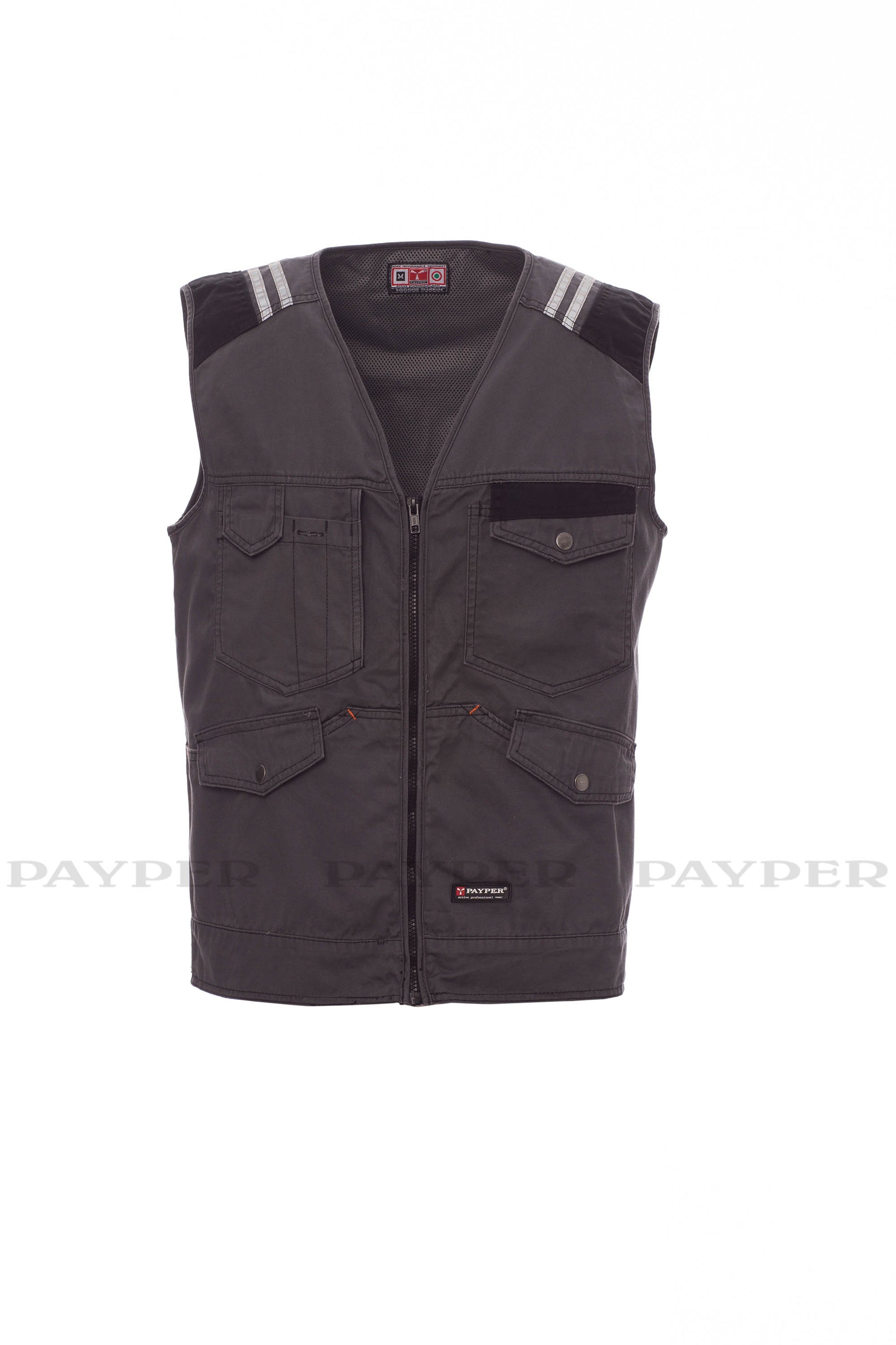 Colete em dois tons de homem, fecho dianteiro, de correr plástico, fecho de botão na cintura, três bolsos dianteiros com LOCK SYSTEM, dois bolsos canguru com aba e botão metálico suporte de crachá destacável, rebatível, bolso de lapela multi-funções. Faixas refletoras nos ombros. Modelos de ajuste aos estilo de calças de ganga. Forro técnico a seco em cor contrastante, abertura para facilitar a estampagem e a aplicação de bordados.