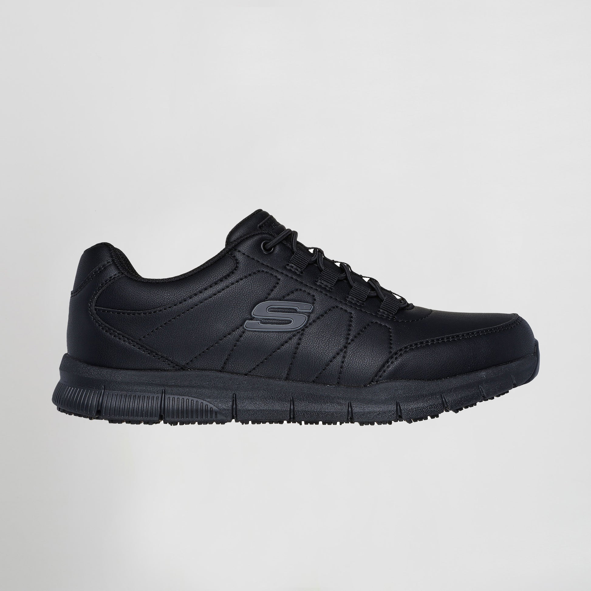 Desfrute de segurança e conforto com Skechers Work™: Nampa - Osil. Este modelo desportivo apresenta uma parte superior sintética com atacadores elásticos, sola antiderrapante e palmilha almofadada Skechers Memory Foam™ para maior conforto.